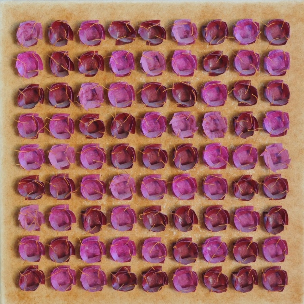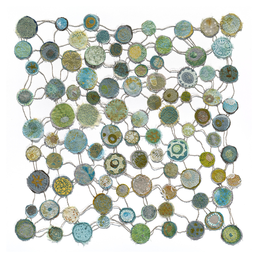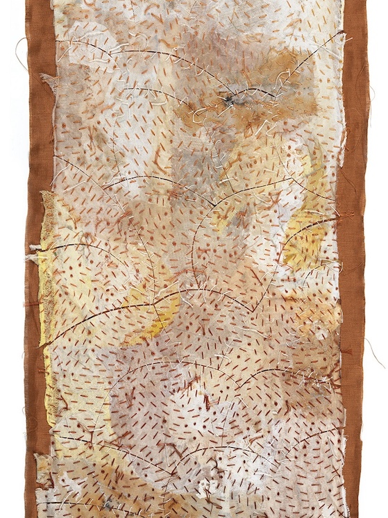 This work encapsulates Lucie’s repetitive, muddled efforts to find inner calm. Layers of textiles and paper, meticulously secured through hand stitching, reveal the observer's perception of the fragile balance between delicacy, determination, and strength.