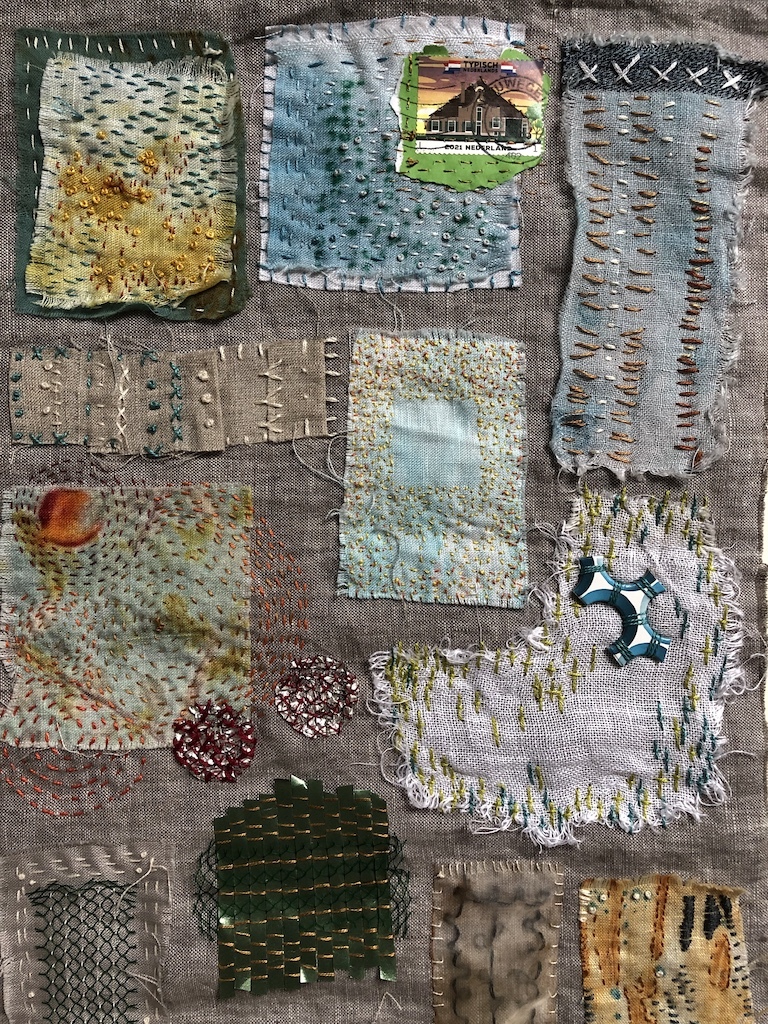 In 2021 Lucie and her husband found themselves stranded in the Netherlands, unable to return to their home in Australia. During those 8 months Lucie channelled her creativity to maintain a positive outlook. She collected seemingly insignificant items and stitched them onto a piece of cloth, transforming it into a personal diary and a source of inspiration, with each item requiring a unique method of attachment.